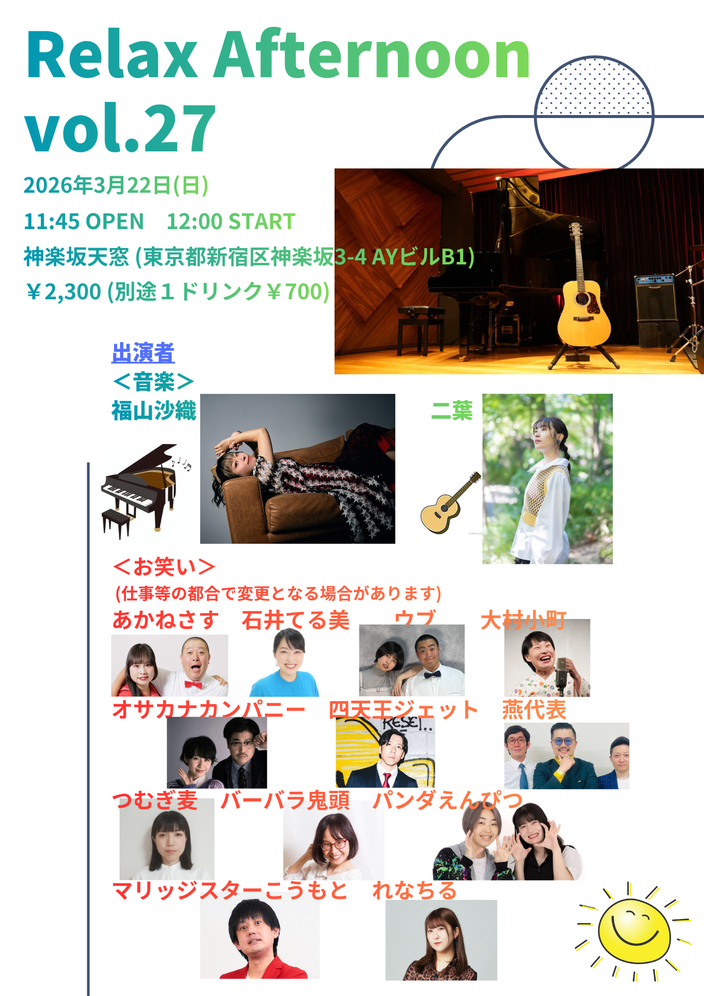 [お笑い] あかねさす / 石井てる美 / ウブ / 大村小町 / 四天王ジェット / オサカナカンパニー / 燕代表 / つむぎ麦 / バーバラ鬼頭 / パンダえんぴつ / マリッジスターこうもと / れなちる